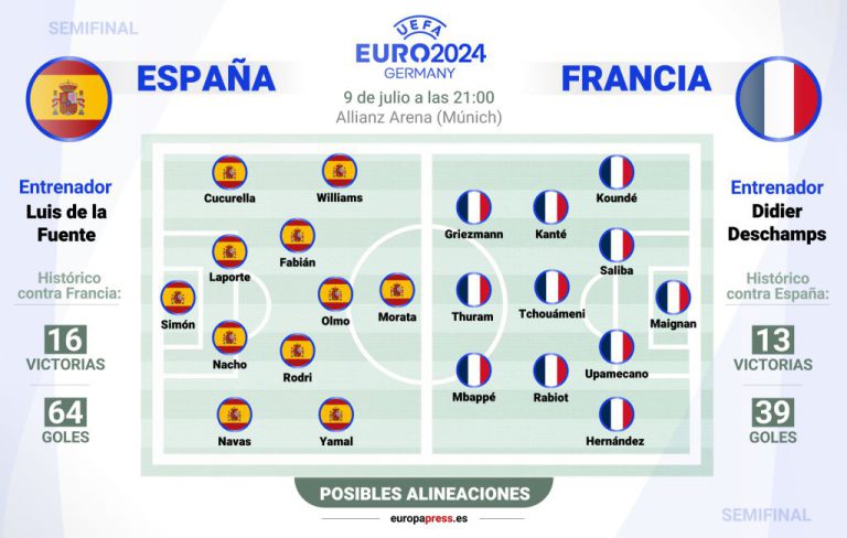 La selección española masculina de fútbol buscará este martes (21.00 horas/La 1) en el Allianz Arena de Múnich la final de la Eurocopa que se está disputando en Alemania frente a otro obstáculo de nivel como el que representa la Francia de Kylian Mbappé, un equipo de gran fortaleza y que llega a estas semifinales después de haber mostrado poco del brillo que se le presupone. España sueña con su quinta final en el torneo continental y en convertirse en la más laureada de la historia el próximo 14 de julio, fecha especial para su rival en la capital bávara, ya que es la Fiesta Nacional del país, que conmemora la toma de La Bastilla en 1789. La ‘Roja’ es la que quiere conquistar ahora una simbólica fortaleza que representan unos ‘Bleus’, que no se le han dado demasiado bien en cruces en su historia, el último, perdido (2-1) en la final de la Liga de Naciones de 2021 donde compitió y tuteó a la entonces campeona del mundo. La primera semifinal mide a los de Luis de la Fuente, que han sobresalido por su valentía y verticalidad, y a los de Didier Deschamps, deseosos de levantar por fin el título continental después de un ciclo bastante positivo, pero no del todo redondo (finales perdidas de la Eurocopa en casa de 2016 y del pasado Mundial y eliminación en octavos de la anterior Eurocopa), y cuyo fútbol apenas ha sido significativo pese a contar con una buena nómina de jugadores que encabeza el ‘enmascarado’ Mbappé. La actual campeona de la Liga de Naciones ni siquiera se achicó por la multitud que llenó el MHPArena el pasado viernes para llevar en volandas a la ‘Mannschaft’, eliminada por el majestuoso cabezazo de Mikel Merino en el último suspiro. El tanto del navarro…