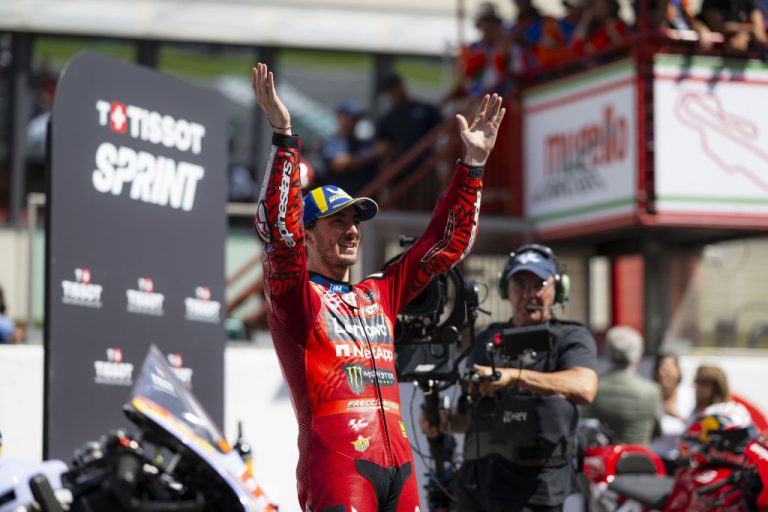 El piloto italiano Francesco Bagnaia (Ducati) ha logrado este domingo la victoria en la carrera larga de MotoGP del Gran Premio de Italia, séptima prueba del Mundial de motociclismo, en una cita en la que el español Jorge Martín (Ducati) se vio desplazado en la última curva a la tercera posición al ser adelantado por el también transalpino Enea Bastianini (Ducati). Mugello ofreció un final de infarto. Mientras ‘Pecco’ casi saboreaba la bandera a cuadros, Bastianini superaba al madrileño en la última curva para completar el doblete del Ducati Lenovo Team -que este domingo cambió el rojo por el azul en homenaje al Día de la República Italiana- y dejar con cara de circunstancias a los ocupantes del garaje del Prima Pramac Racing. Con este triunfo, ‘Pecco’ completa un fin de semana perfecto imponiéndose tanto al esprint como en la carrera larga, en ambos casos partiendo desde el quinto lugar de salida. Martín, que se cayó el sábado, tuvo que conformarse este domingo con un tercer puesto que reduce su ventaja al frente de la general del Mundial. Así, con 171 puntos, atesora 18 de renta sobre el bicampeón del mundo, mientras que Marc Márquez (Ducati), que se vio apeado de las posiciones de podio en la penúltima vuelta y terminó cuarto, es tercero del campeonato a 35 de Martín. Bastianini ocupa el cuarto lugar, a 57. En una salida extraordinaria, ‘Pecco’ Bagnaia pasó de la quinta a la primera posición, ganando cuatro puestos en apenas dos curvas, mientras que el ‘poleman’ Martín se tuvo que conformar con engancharse a su rueda. Además, Enea Bastianini (Ducati) superó a Marc Márquez (Ducati) para situarse tercero. Poco a poco, Bagnaia fue imprimiendo un ritmo estratosférico para distanciarse del de San Sebastián de los Reyes, que tras su caída del sábado en la…