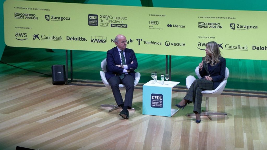 El vicepresidente del Banco Central Europeo, Luis de Guindos, ha expresado su confianza en que la economía española seguirá creciendo a un ritmo más veloz que la zona euro. En este sentido, ha señalado que es imprescindible una «inmigración ordenada» para sostener este modelo económico. Durante el XXIV Congreso de Directivos CEDE, celebrado en el Auditorio de Zaragoza Princesa Leonor, De Guindos compartió su diagnóstico sobre la economía en un diálogo con Mar Vaquero, vicepresidenta y consejera de Presidencia, Economía y Justicia del Gobierno de Aragón.