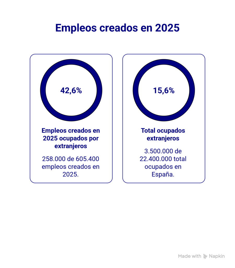 Si cruzamos estos informes con los de empleo, coinciden en términos relativos. En 2025 se crearon 605.400 empleos, según la Encuesta de Población Activa (EPA), hasta alcanzar los 22,4 millones de personas. De esos nuevos trabajos, 258.000 los consiguieron personas nacidas fuera de España. Con esas cifras, los ocupados extranjeros llegaron a 3,5 millones de personas.