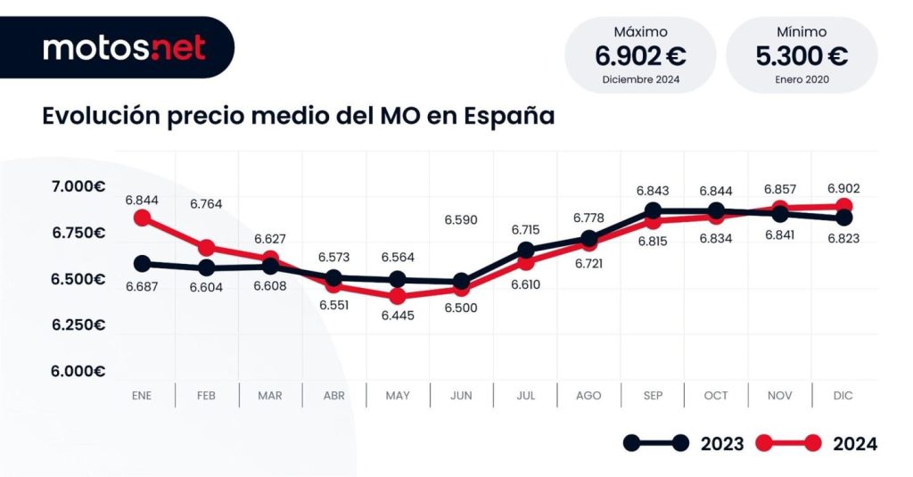 El barómetro anual de Motos.net, en colaboración con la Asociación Nacional de Empresas del Dos Ruedas (Anesdor), revela que el precio de oferta de las motos de ocasión cerró el año 2024 con un incremento del 1,2% respecto al año anterior, alcanzando un precio medio de 6.902 euros. Este dato marca un nuevo récord en España, destacando la creciente popularidad y la evolución del mercado de este tipo de vehículos de dos ruedas.