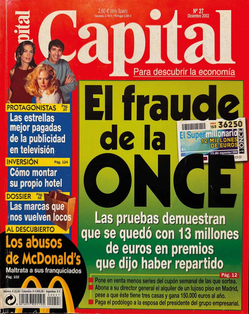 Capital apostó por el periodismo de investigación, y buena prueba de ello es este número, en el que la revista destapó uno de los casos de fraude más relevantes del 2001: una apropiación de premios supuestamente retenidos por la ONCE. En total, 13 millones de euros que decía haber repartido.