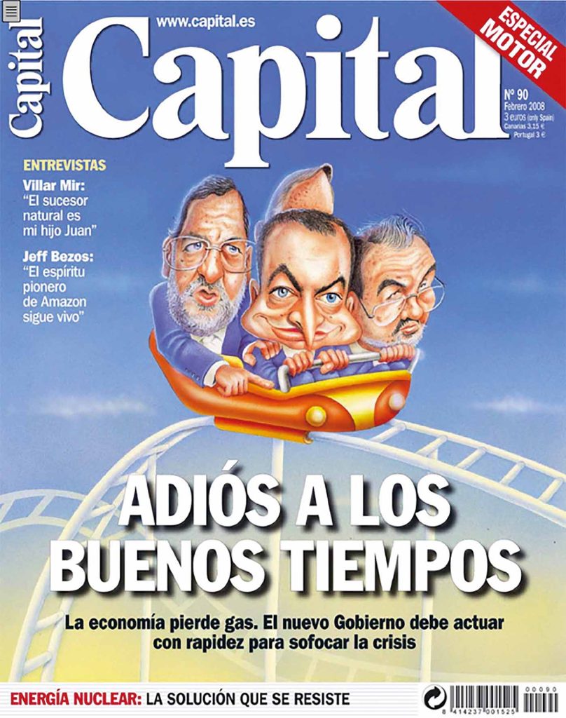 Los meses previos al pinchazo de la burbuja inmobiliaria fueron de desconcierto. La revista tituló su portada con un esclarecedor ‘Adiós a los buenos tiempos’, con una viñeta protagonizada por José Luis Rodriguez Zapatero, Pedro Solbes y Mariano Rajoy subidos a una montaña rusa. La gran crisis se avecinaba.