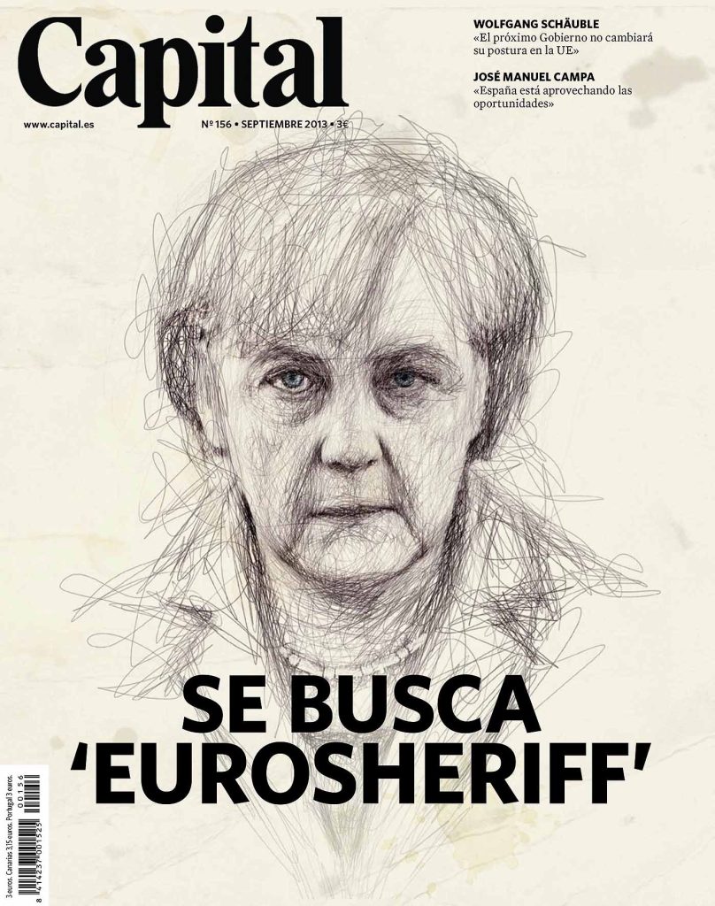 ‘Se busca eurosheriff’. Con este titular y un boceto de Angela Merkel a carboncillo, la revista apuntaba la necesidad de un nuevo liderazgo en la zona euro, que poco a poco resurgía de la crisis financiera y posterior crisis de deuda iniciada en 2008. Cinco años de crisis interminable tocaban, poco a poco, a su fin.