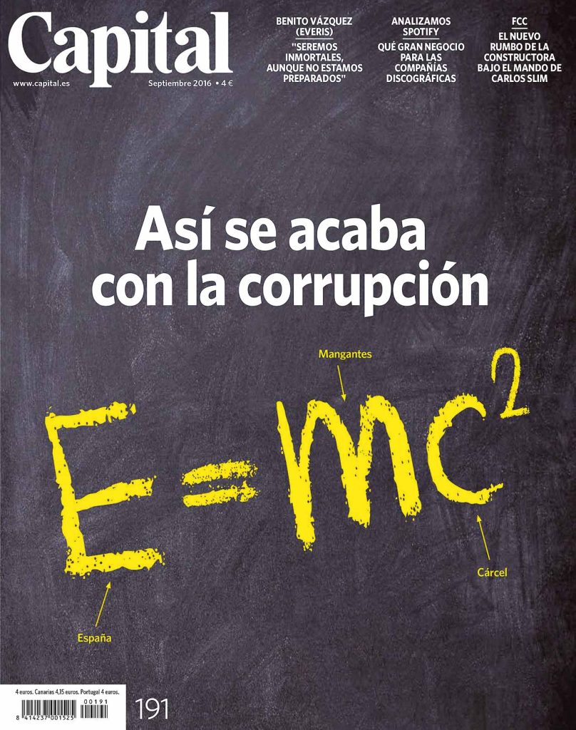 La avalancha de casos de corrupción que vivía España en 2016, que, a la postre, provocaron un cambio de Gobierno en 2018, llevó a Capital a posicionarse con un consejo práctico en portada. “Así se acaba con la corrupción. E (España) = m (mangantes) c (cárcel)”. Claro y conciso.