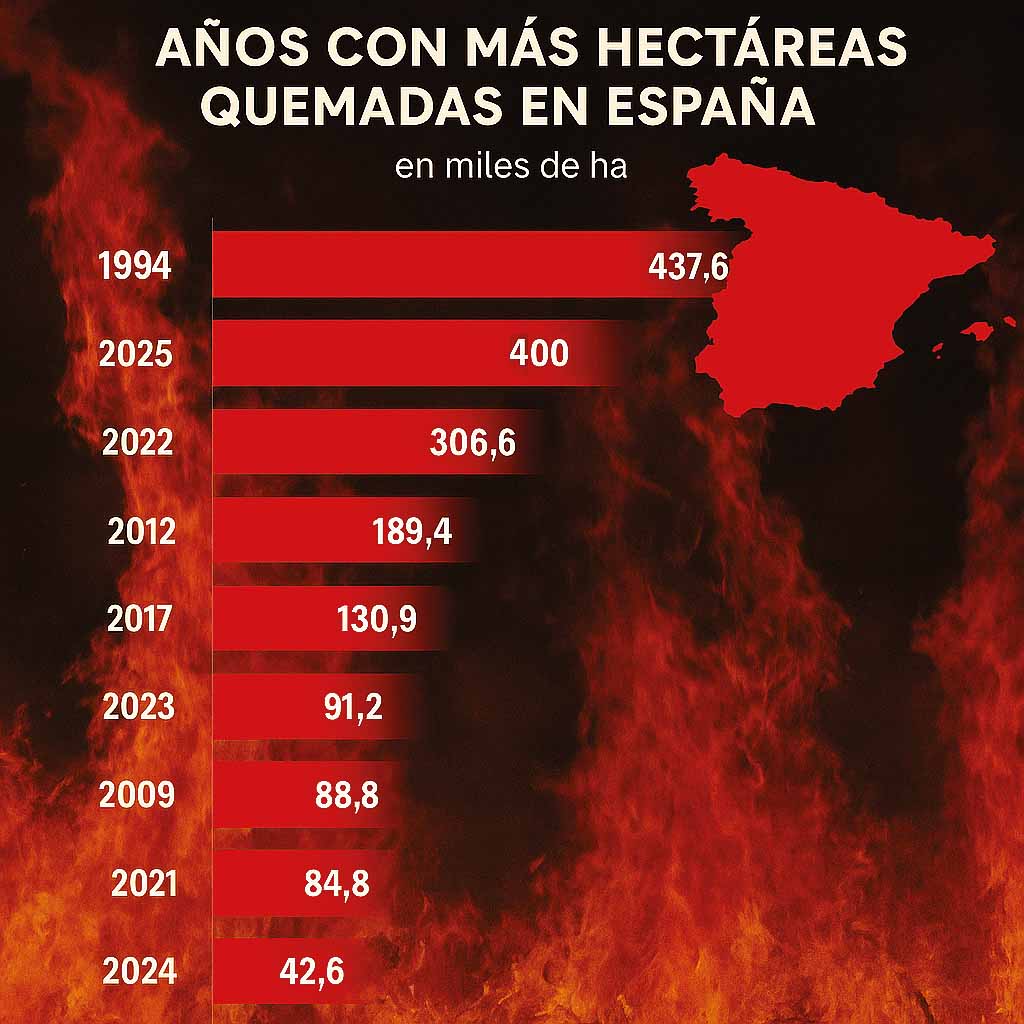 De esta forma, 2025 ya está entre los años con más superficie quemada desde que hay registros: las estimaciones provisionales lo colocan por detrás de 1994 y por encima de todos los años del siglo XXI hasta ahora. 1994 sufrió la quema de 437.000 hectáreas, frente a las más de 400.000 de 2025 que señalan las estimaciones actuales de Copernicus.